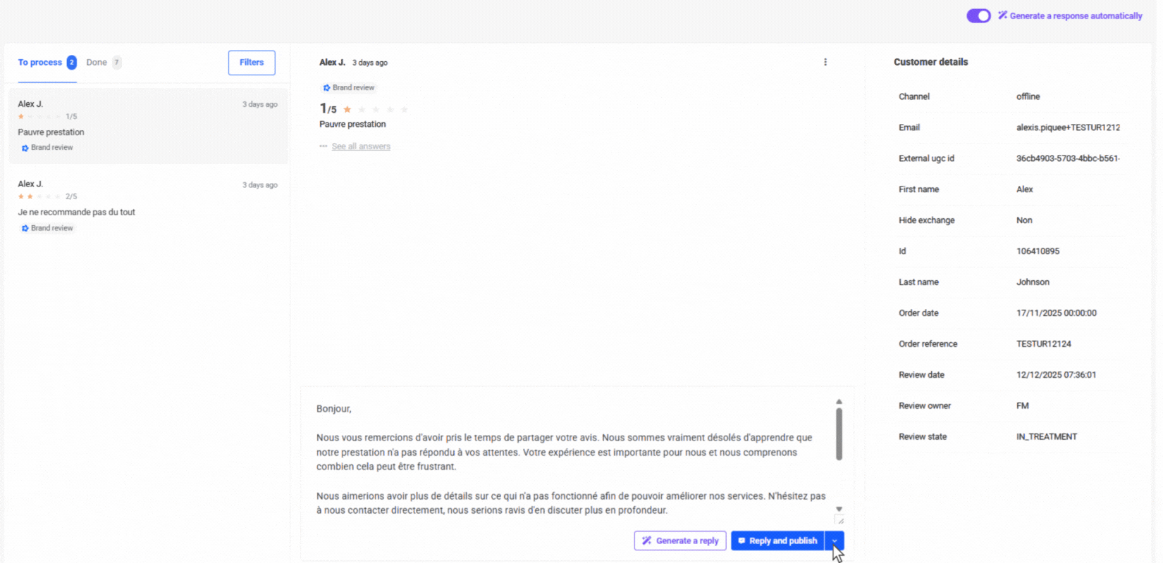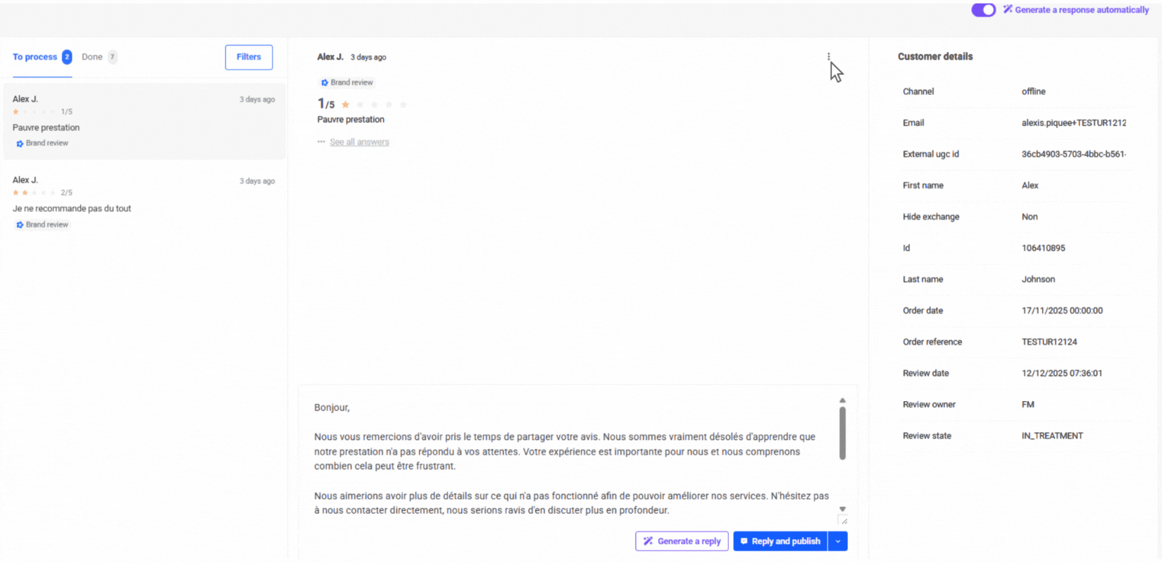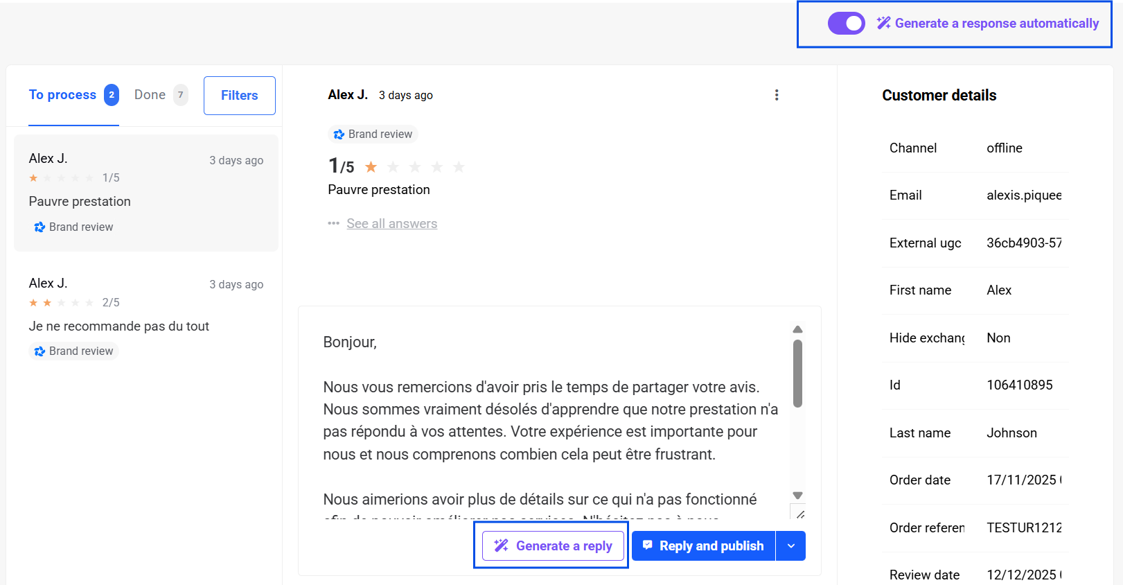 This feature allows you to process and respond to customer feedback (Verified Reviews, Feedback, and Google Reviews), gain a global view of customer sentiment, and provide personalized responses thanks to our embedded AI model. It highlights customer feedback, humanizes your brand, and encourages others to share their own experience.