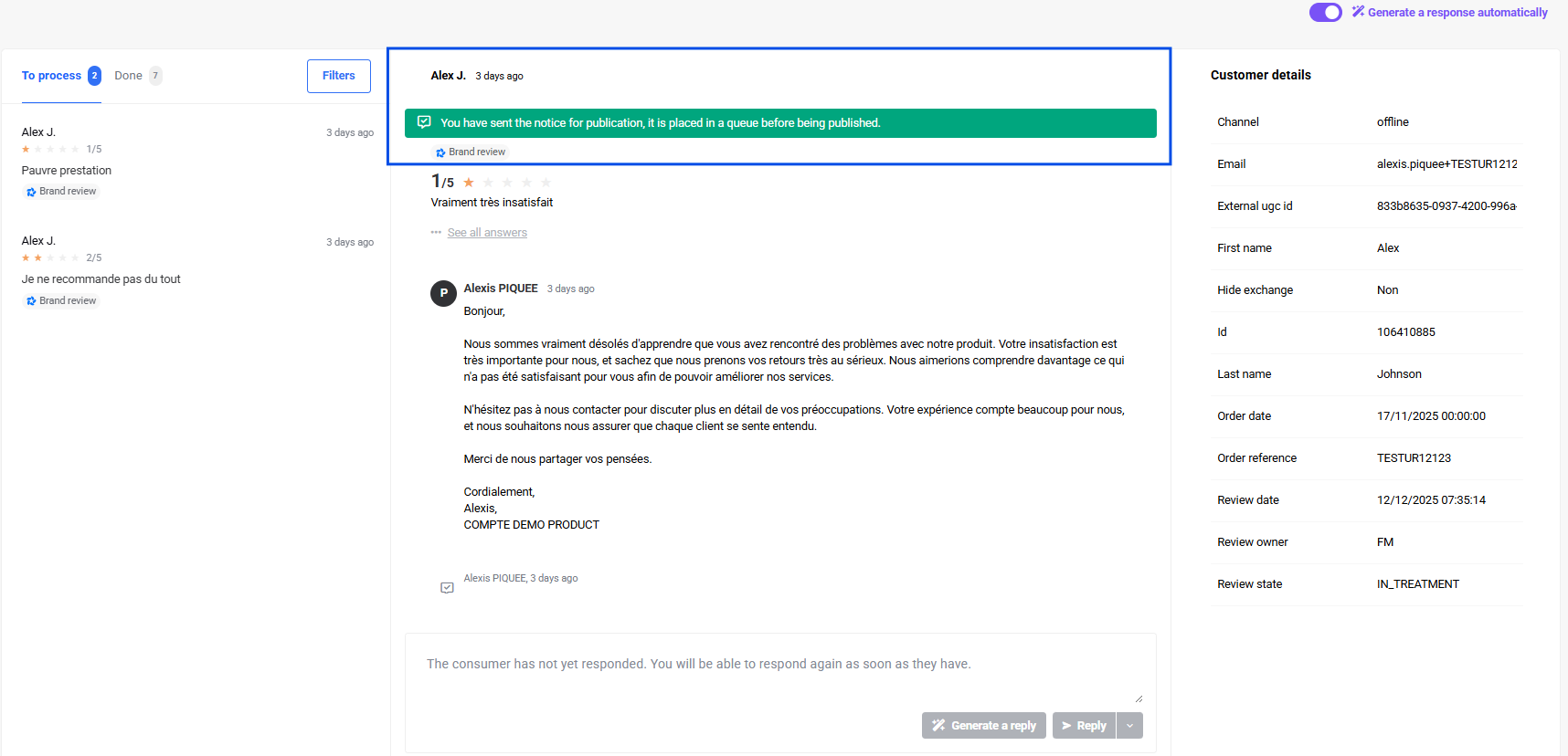 - A green bar confirms that the review has been published automatically. However, the review or feedback remains visible in the “To process” section. Depending on the content type, you can still reply to it, report it, or decide to archive it.