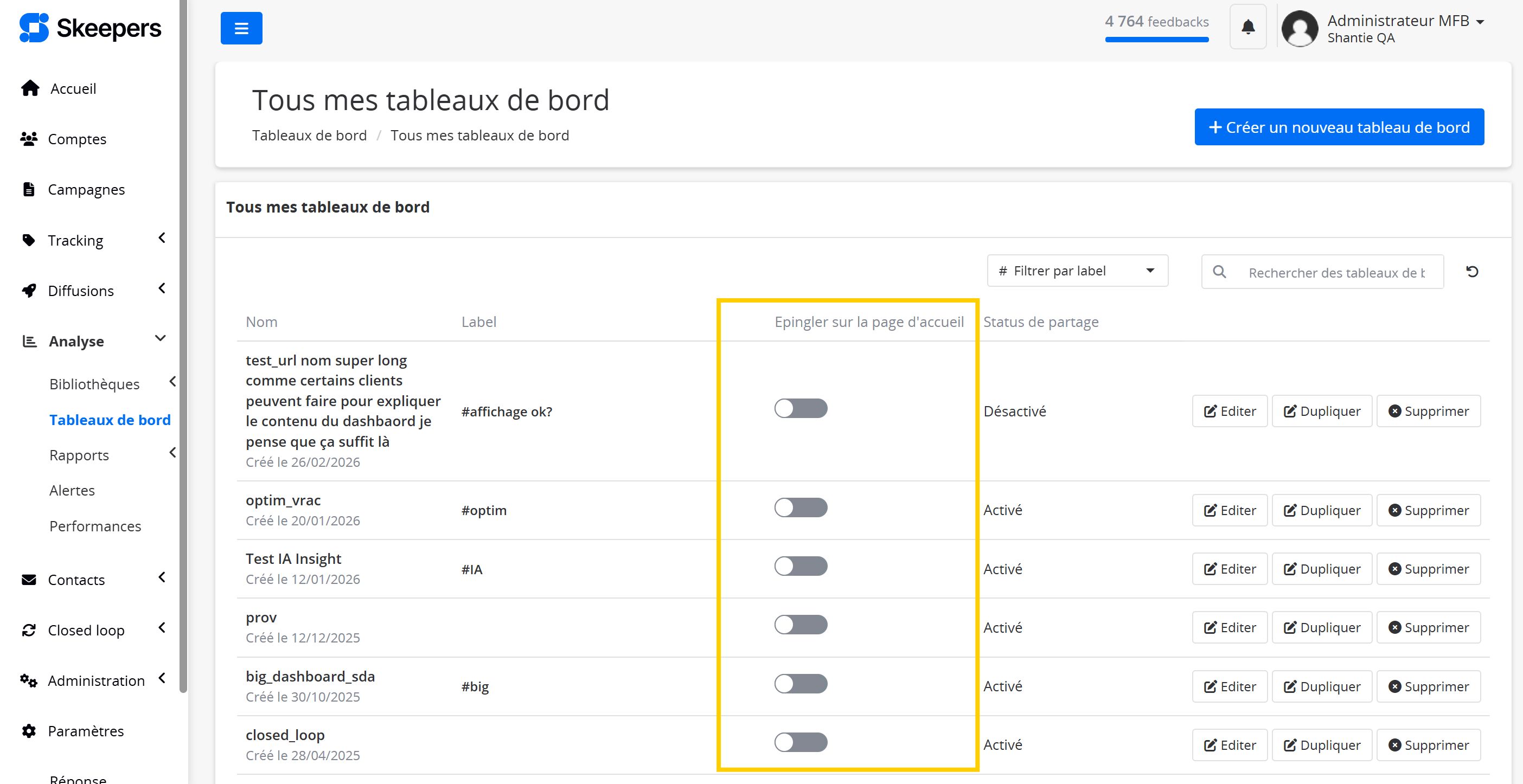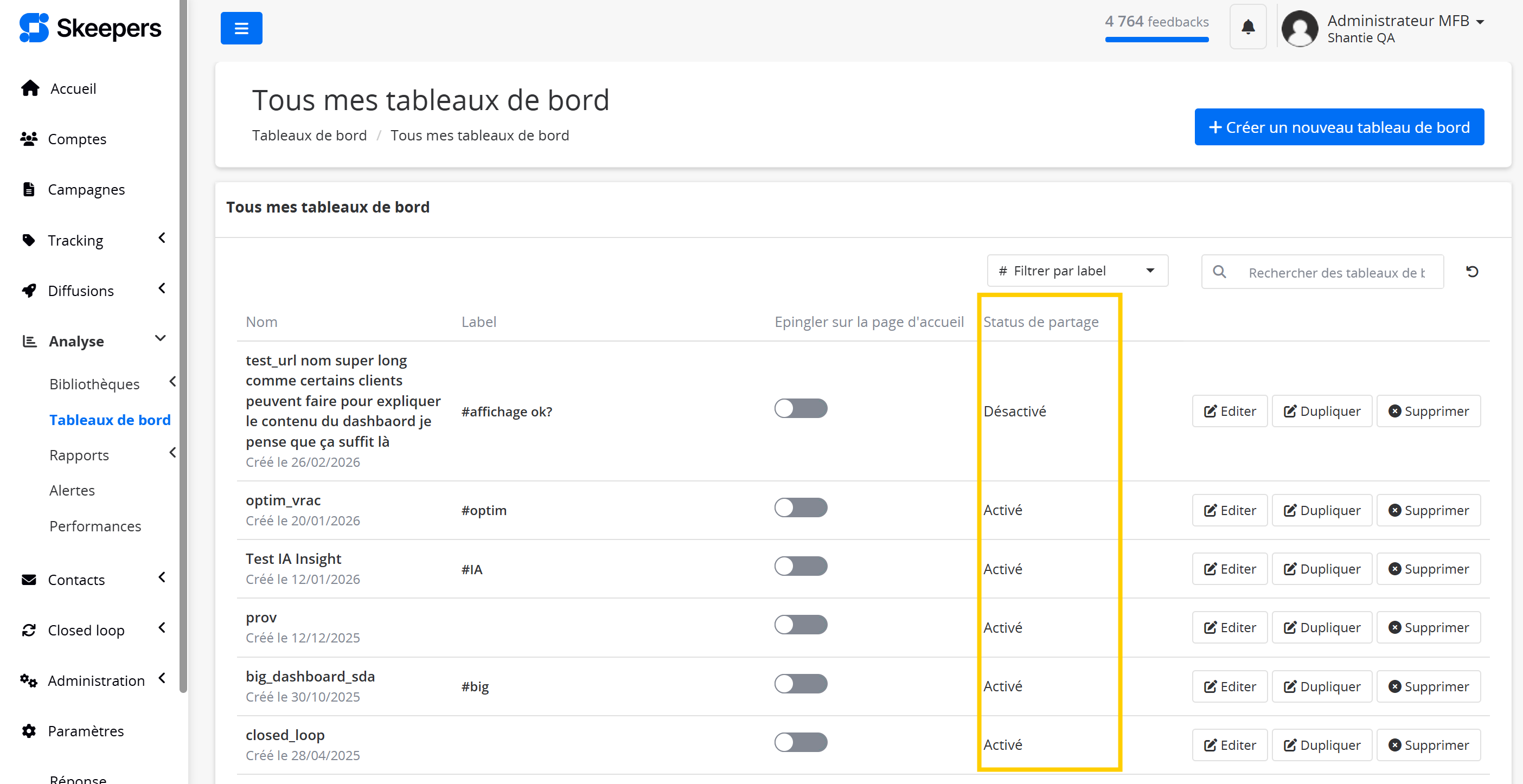 A new column is available in the dashboard list to display the sharing status (Activated / Deactivated):