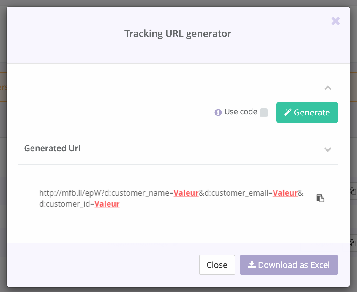 If you have set up Attributes, generate a new URL including them to facilitate the tracking of your campaign by clicking on the URL Generator: