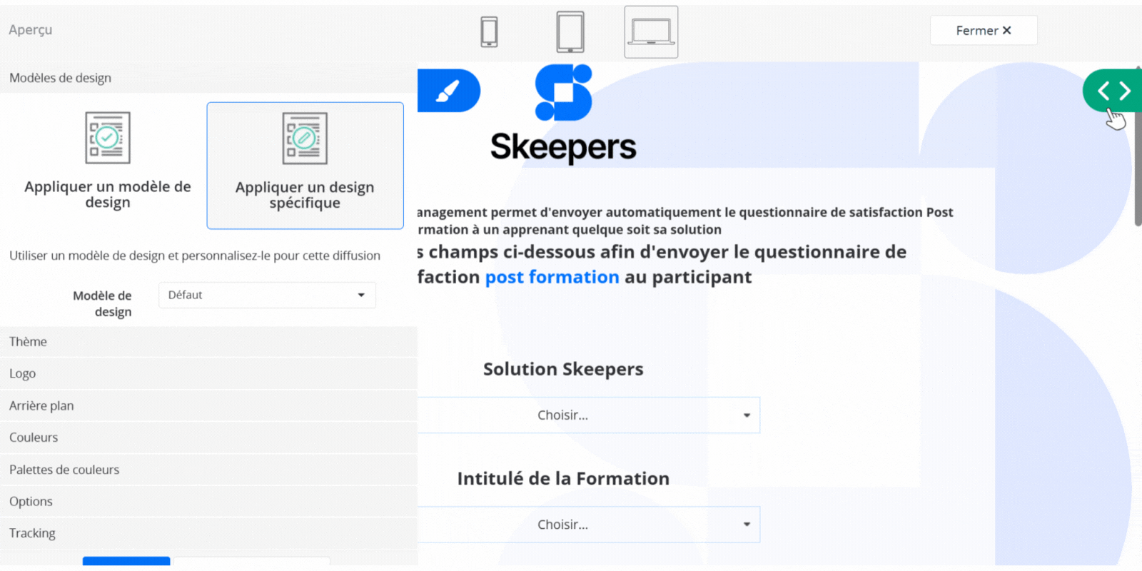 We have optimized the different themes to offer the best possible experience to your respondents. Advanced graphic customization allows you to go even further. However, we recommend involving a member of your technical team when using this feature.