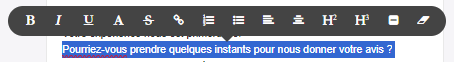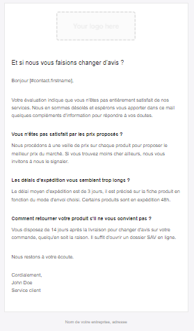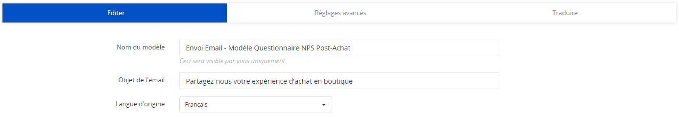 | Invitation à répondre au questionnaire | Invitation à répondre avec question intégrée | Notification interne | Notification client | Email de réponse à un avis consommateur |