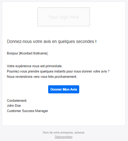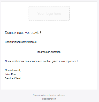 For the email content, we invite you to first remove the "Your logo here" box to drag and drop your own organization logo.