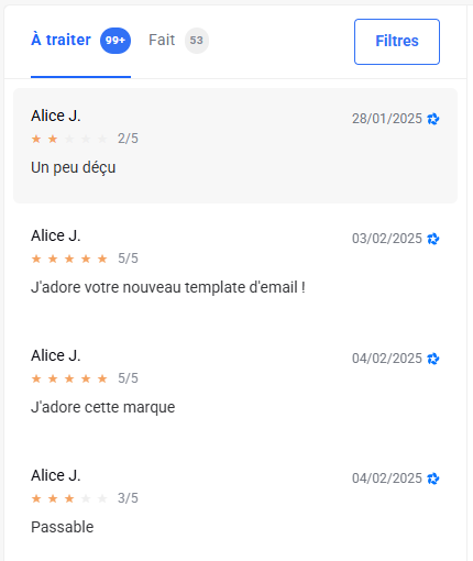 Actions possibles pour Feedbacks et Avis Google
