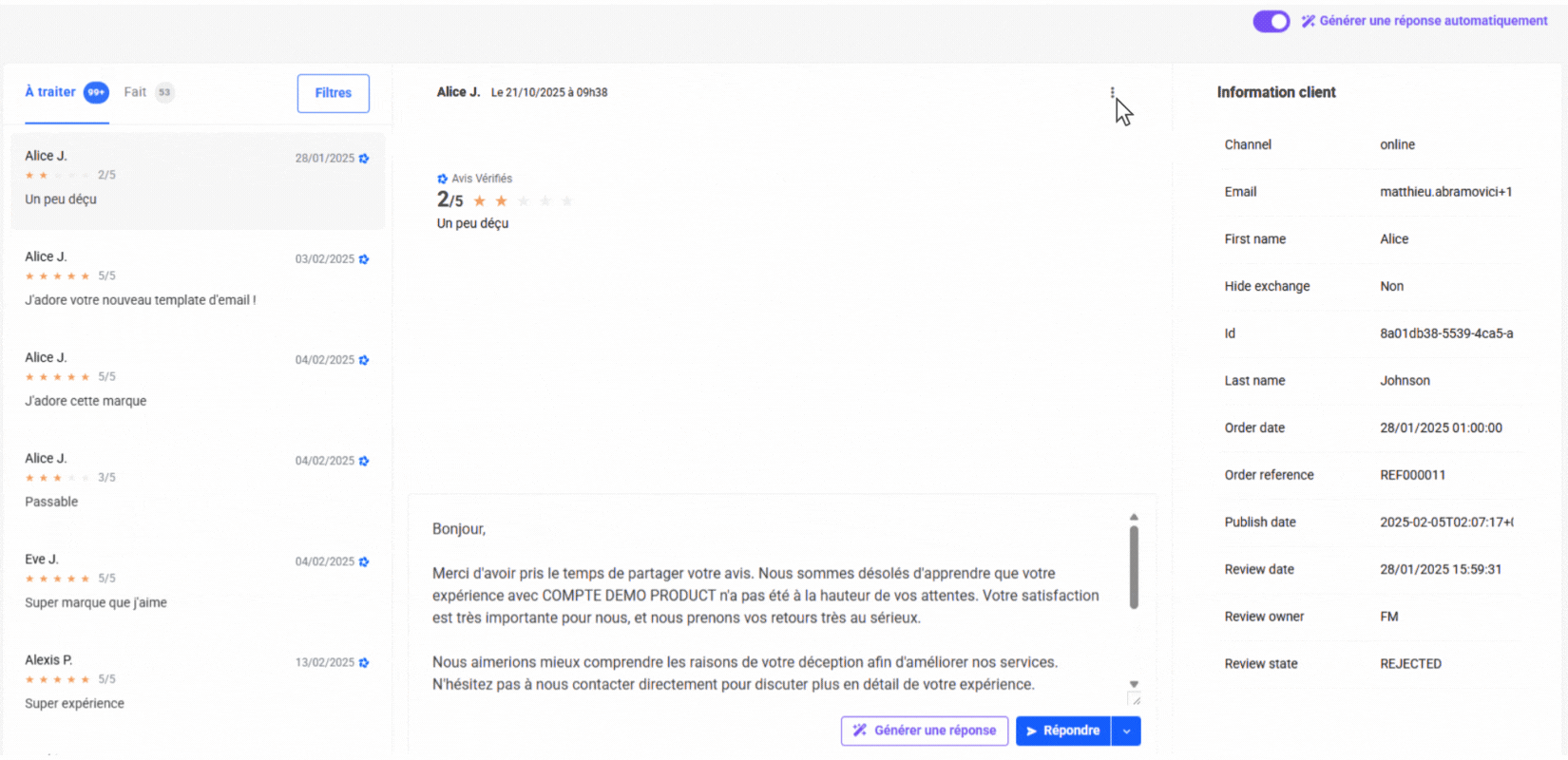 Générer une réponse automatiquement: L’IA génère des suggestions de réponses.