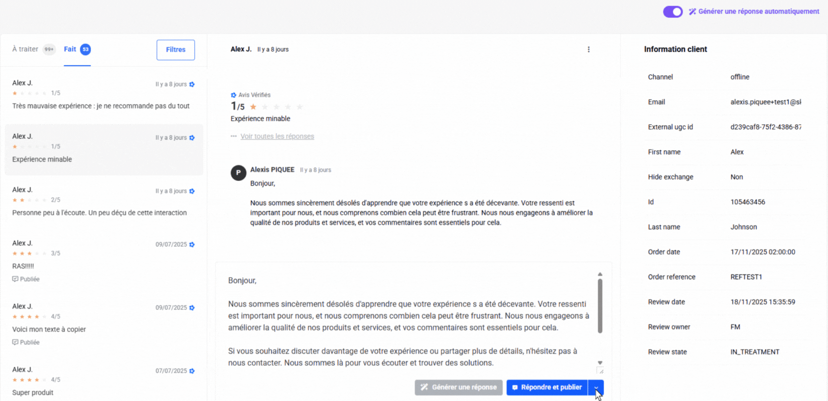 Modifier la réponse générée par l’IA avant publication.