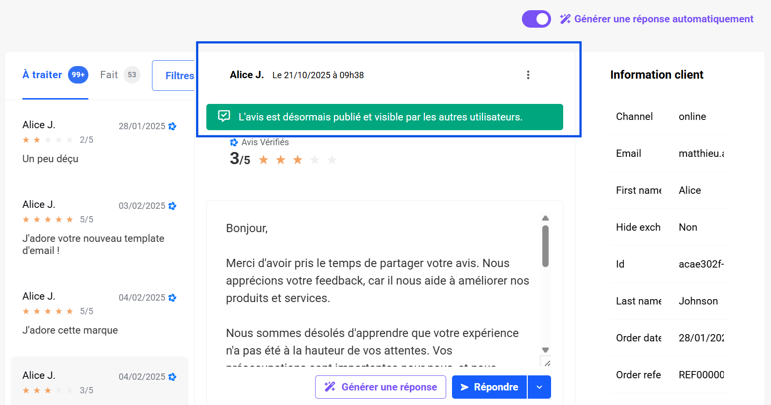 - Une barre verte confirme que l’avis a été publié automatiquement. Toutefois, l’avis ou le feedback reste visible dans la section “À traiter”. Selon le type de contenu, vous pouvez encore y répondre le signaler, ou décider de l'archiver.