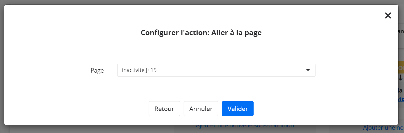 , sélectionnez l’action "Aller à la page", puis choisissez la page d’inactivité que vous avez créée dans votre campagne.