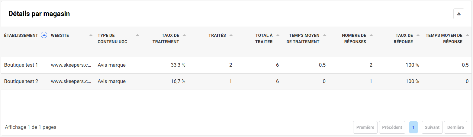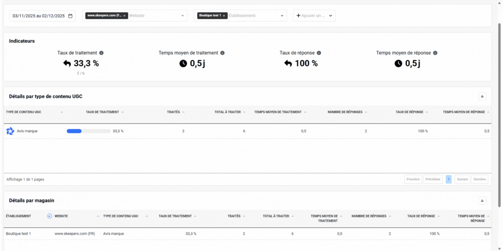 Appliquer des filtres : Utilisez les options de filtre du tableau de bord pour personnaliser les vues par site web, établissement, canal, note, type d’UGC, pays et période.