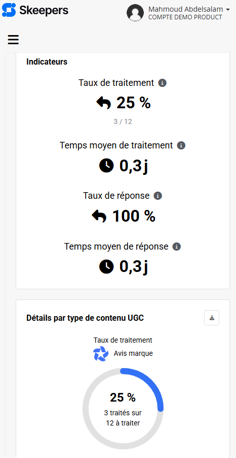 Le tableau de bord offre une vue globale des indicateurs liés au traitement et à la réponse aux contenus générés par les utilisateurs, permettant de suivre l’efficacité, de repérer les points bloquants et d’améliorer l’engagement client. Il s’intègre parfaitement à l’interface Feedback Management avec un design familier et des filtres avancés.