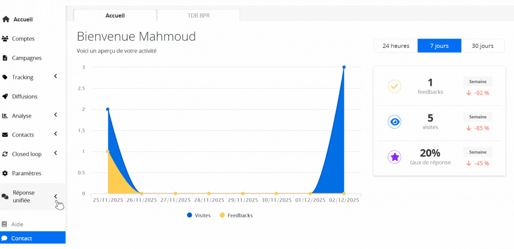 Accéder à la plateforme Feedback Management : dans le menu latéral gauche, vous trouverez la section