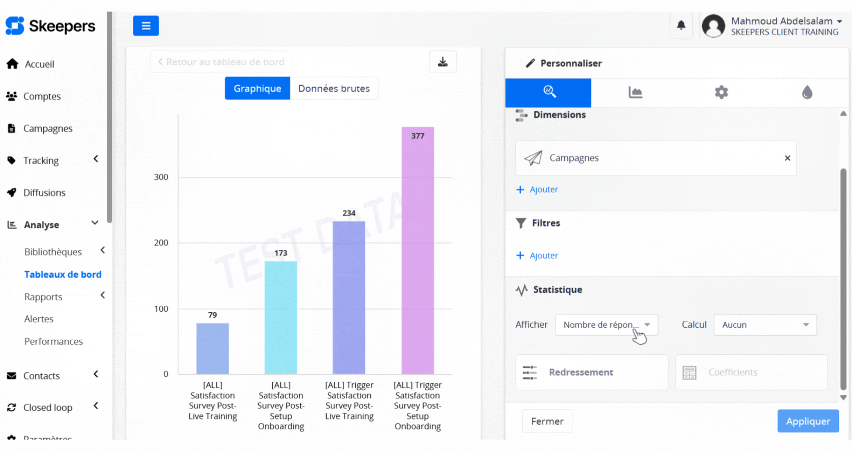 Sur notre graphique, ce sont les Réponses qui sont affichées. Nous allons modifier ce paramètre pour afficher le Taux de questionnaire terminé.