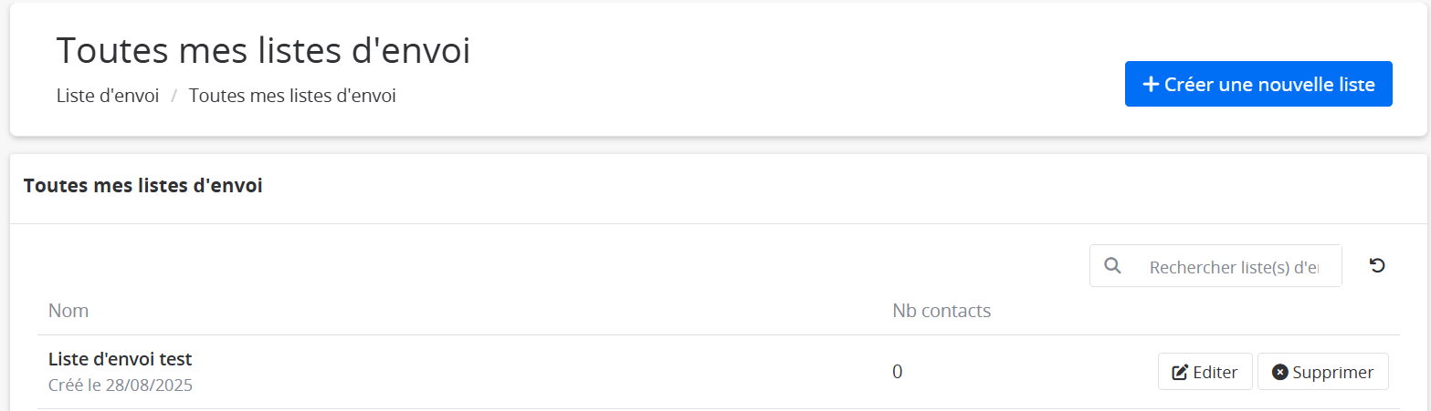 Une fois de retour dans la liste de vos listes d'envoi, vous pouvez éditer votre nouvelle liste ou la supprimer. Par défaut, elle ne contient aucun contact.